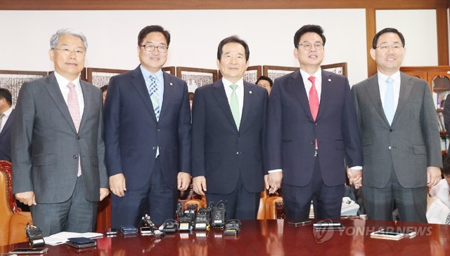 정세균 국회의장과 여야 4당 원내대표가 29일 오전 국회 의장실에서 채택이 무산된 이낙연 국무총리 후보자 청문 보고서 논의를 위해 만나고 있다. 왼쪽부터 국민의당 김동철·더불어민주당 우원식·정 의장, 자유한국당 정우택·바른정당 주호영 원내대표.