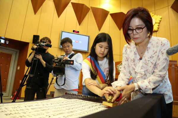 지난 27일 구로근린공원에서 대한민국 최초로 건국된 구로어린이나라 건국 선포식이 개최됐다. 사진은 선포식 후 구로구의회 본회의장에서 구로어린이나라 손지우 대통령이 건국선언문에 국새를 찍는 모습.(사진제공=구로구청)