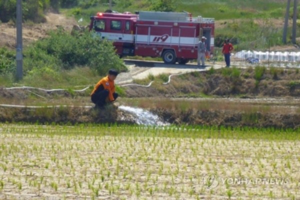 | ▲ 전남 신안군의 한 논에서 가뭄 피해를 막기 위해 소방차를 동원해 급수를 하고 있다.(사진제공=연합뉴스) | ||