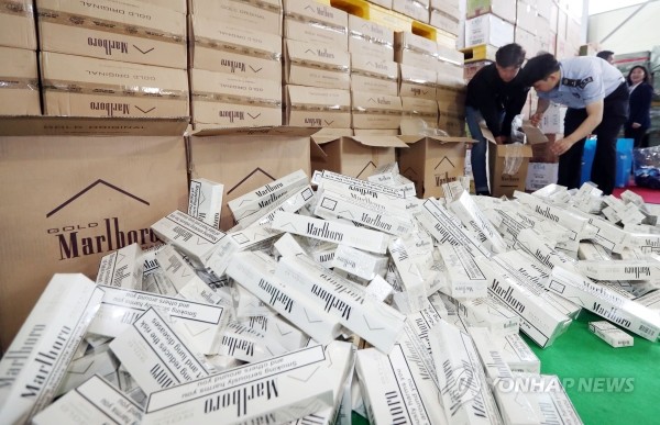 | ▲ 31일 오전 인천 중구 인천본부세관에서 직원들이 압수한 밀수입 · 가짜 담배를 공개하고 있다.(사진제공=연합뉴스) | ||