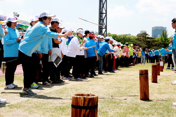 최근 잠실종합운동장 보조경기장에서 ‘제12회 송파구민체육대회’가 개최됐다. 사진은 체육대회 참가자들이 일렬로 서서 투호 경기를 하고 있는 모습.(사진제공=송파구청)