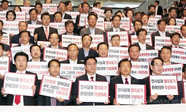 자유한국당 정우택 대표 권한대행 겸 원내대표를 비롯한 의원들이 31일 오후 국회 본회의에서 이낙연 총리후보자 임명 동의안이 상정되자 퇴장해 로텐더홀 계단에서 ‘문재인 정부의 자기모순적 인사참사! 국민 앞에 사죄하고 부적격자 지명 즉시 철회하라!’라며 피켓시위를 벌이고 있다.