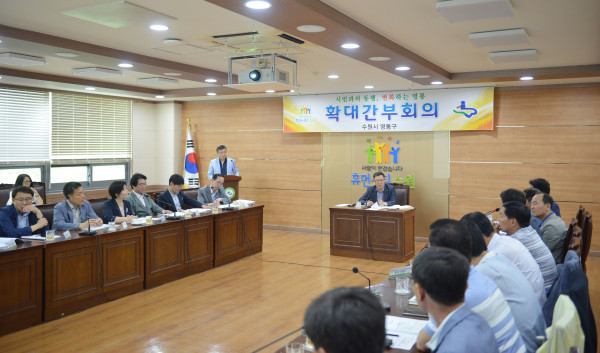 경기 수원시 영통구는 지난 30일 '6월 중 확대간부회의'를 진행했다. 사진은 이상훈 구청장(가운데)이 구청 관계자들에게 6월 중 각 과·동 업무계획 및 2017년 선진영통 문화시민운동 추진 실적·계획 등에 대해 보고받는 모습.(사진제공=영통구청)