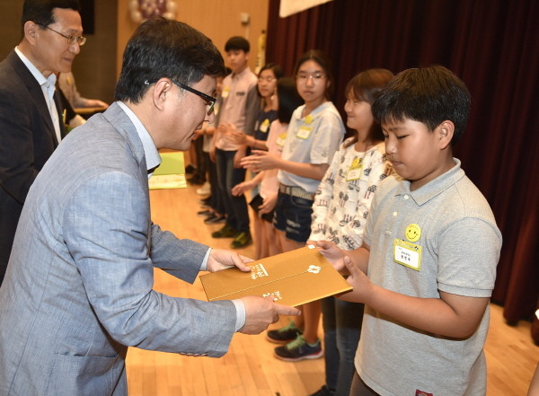 최근 서울 노원구는 ‘청소년의 달’을 기념해 구청 대강당에서 ‘2017년 모범 어린이 청소년 및 유공자 표창수여식’을 개최했다. 사진은 김성환 구청장이 유공자 어린이에게 표창장을 수여하고 있는 모습.(사진제공=노원구청)