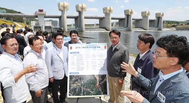 자유한국당 정우택 대표 권한대행(왼쪽 세번째)과 의원들이 4일 오전 충남 공주시 공주보를 방문, 가뭄 피해확산 방지 대책 마련을 관계자들에게 주문하고 있다.