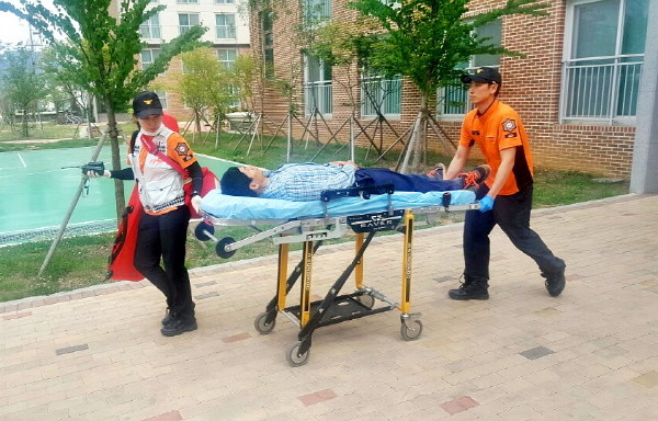 최근 경기 연천소방서는 최근 연천읍에 위치한 아이파크 아파트에서 관리사무소 직원, 입주민 등과 함께 고층건축물 화재 대비 합동소방훈련을 실시했다. 사진은 긴급구조대가 환자를 이송하는 훈련을 하고 있는 모습.(사진제공=연천소방서)