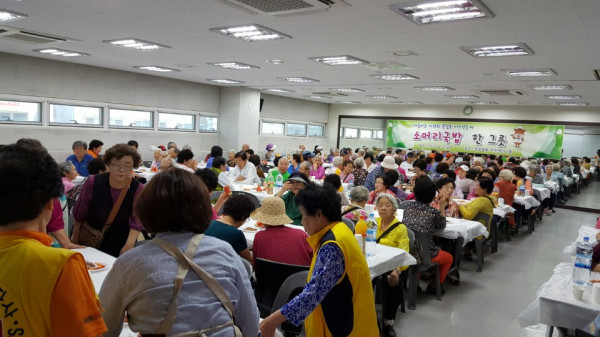 서울 중랑구 망우본동주민센터에서는 지난 2일 망우본동복합청사 2층에서 지역 노인 1000여명을 초대해 소머리국밥을 대접하는 행사를 개최했다. 사진은 노인들이 식사하는 모습.(사진제공=중랑구청)