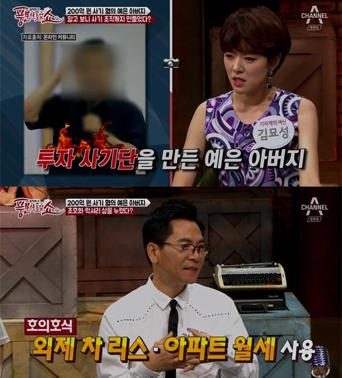 이에 한은정이 “예은 아버지는 실제로 투자한 건지?”라고 묻자 연예부 기자는 “단 한 건도 투자한 건 없다. 오히려 투자 받은 돈을 외제 차 리스, 아파트 월세로 사용했다. 그러니까 전형적인 사기라고 보면 된다”고 답했다.