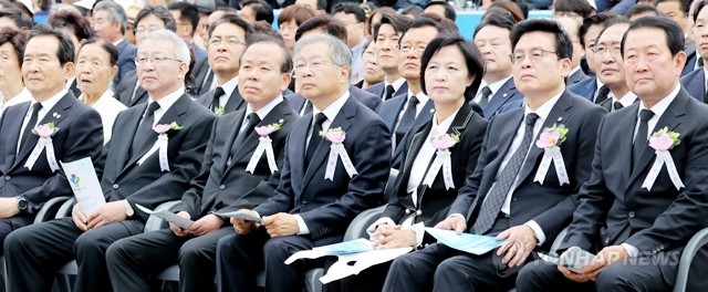 정세균 국회의장(왼쪽부터)과 양승태 대법원장, 김이수 헌법재판소장 후보자, 김용덕 중앙선관위원장, 더불어민주당 추미애 대표, 자유한국당 정우택 당 대표 권한대행 겸 원내대표, 국민의당 비대위원장이 6일 오전 서울시 동작구 동작동 국립현충원에서 열린 제62회 헌충일 추념식에 참석해 앉아 있다.
