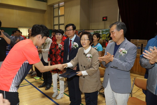 신연희 강남구청장(오른쪽 두 번째)이 지난 6일 오후 수서스포츠문화센터에서 개최된 ‘제23회 구청장배 탁구대회’에 참석해 대회 입상자를 격려하고 악수를 나누고 있다.(사진제공=강남구청)