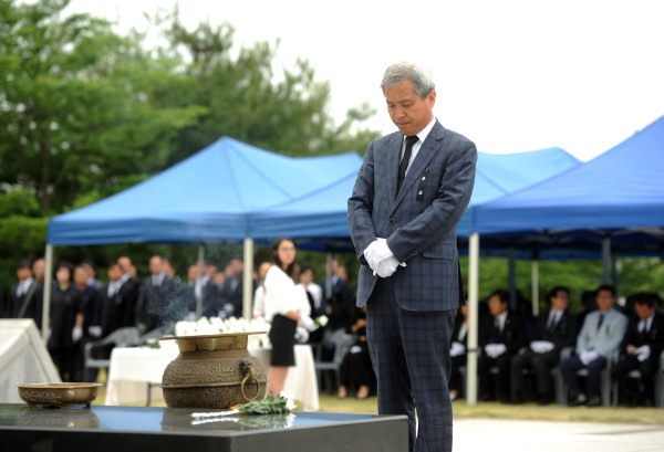 경기 오산시는 지난 6일 수청동 수청공원에 위치한 현충탑에서 곽상욱 시장을 비롯한 보훈단체장, 보훈가족, 지역내 사회단체장, 지역주민 등이 참석한 가운데 '현충일 추념식'을 개최했다. 사진은 곽 시장이 헌화를 하는 모습.(사진제공=오산시청)