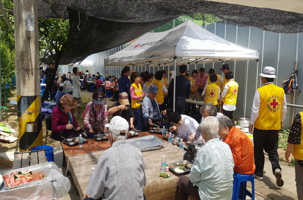 인천 남구 용현2동은 지난 5일 철길공원에서 용현2동 적십자회 봉사원들과 주민자치위원회, 방범대원, 통장 등이 참여한 가운데 노인을 위한 ‘사랑의 적십자 무료급식 행사’를 개최했다. 사진은 행사에 참여한 노인들이 식사하는 모습.(사진제공=남구청)