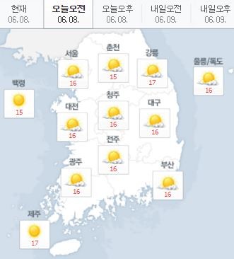 이날 오전 서울은 16도, 춘천 15도, 대전 16도, 청주 16도, 대구 16도, 전주 16도, 부산 163도, 광주 16도를 기록중이다.