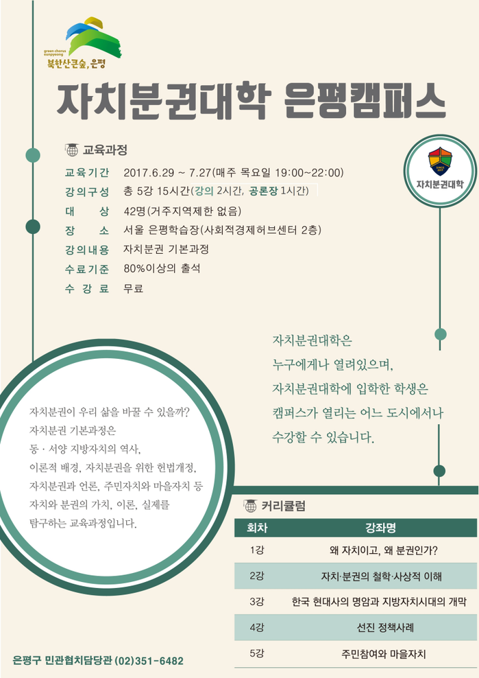 구 관계자는 “이번 자치분권대학 프로그램을 통해 시민들의 집단지성을 고양하고 토론으로 모아진 다양한 의견들이 은평 자치분권의 정책적 전망을 밝히는 계기가 되도록 디딤돌을 놓고자 한다”고 말했다.