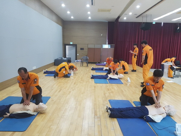경기 화성소방서는 지난 7∼8일 양일간에 걸쳐 현장에 출동하는 소방공무원을 대상으로 소방전술훈련평가를 실시했다. 사진은 8일 소방공무원들이 심폐소생술 능력 평가를 진행 중인 모습.(사진제공=화성소방서)