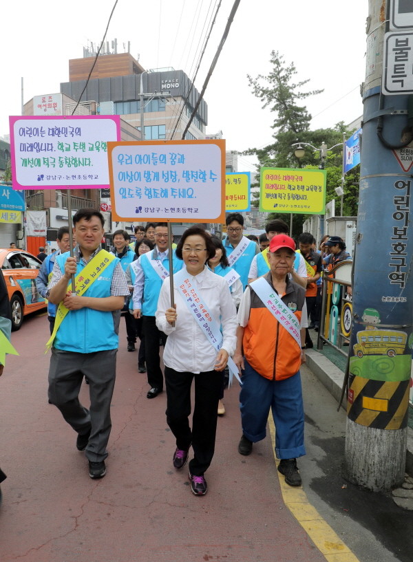 신연희 서울 강남구청장이 8일 진행된 ‘교육환경 계도 및 캠페인’에 참가해 논현초등학교 일대에서 관계자들과 함께 ‘우리 아이들의 꿈과 이상이 밝게 성장, 발전할 수 있도록 협조해 주세요’라는 홍보문구가 적힌 피켓을 들고 주민들에게 홍보를 하고 있다.(사진제공=강남구청)
