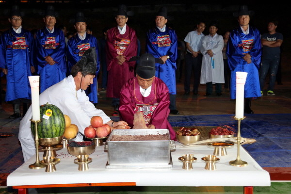 경기 안성시는 지난 5일 연일 지속되는 가뭄으로 농민들이 어려움을 겪고 있는 가운데 안성지역 농업인단체들과 함께 안성천변에서 가뭄극복을 위한 '합동 기우제'를 지냈다. 사진은 황은성 시장(가운데)이 기우제를 지내고 있는 모습.(사진제공=안성시청)