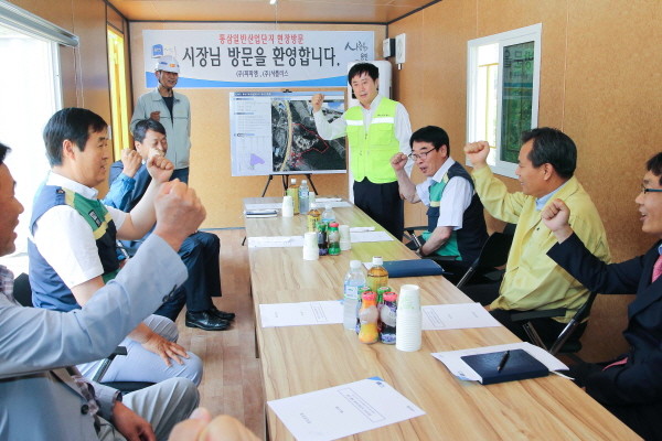 정찬민 경기 용인시장은 지난 8일 용인의 첫 공공산업단지인 처인구 이동면 소재 용인테크노밸리 공사현장을 방문해 직원들을 격려하고, 사업진행 현황을 점검했다. 사진은 정 시장(오른쪽 네 번째)과 관계자들이 격려구호를 외치는 모습.(사진제공=용인시청)