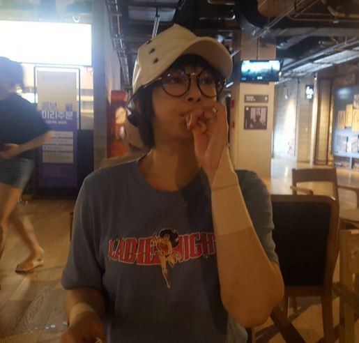 사진 속 선우선은 흰색 캡 모자와 동그란 안경을 쓴 채 멍한 표정을 짓고 있으며 무언가를 입에 물고 있어 눈길을 끌었다.