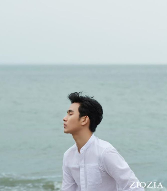 사진 속 김수현은 바다를 배경으로 화이트셔츠를 입은 옆모습으로 카메라 앞에 서 있다.
