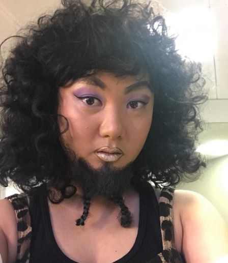 박나래는 보라색 아이쉐도우와 누트톤 립스틱, 갈매기 눈썹으로 메이크업을 완성했다. 여기에 펌이 된 가발과 수염 분장으로 웃음을 자아낸다.
