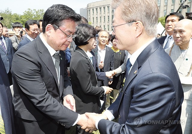 문재인 대통령(오른쪽)이 10일 오전 서울광장에서 열린 제30주년 6.10 민주항쟁 기념식을 마치고 자유한국당 정우택 당 대표 권한대행과 악수하고 있다.