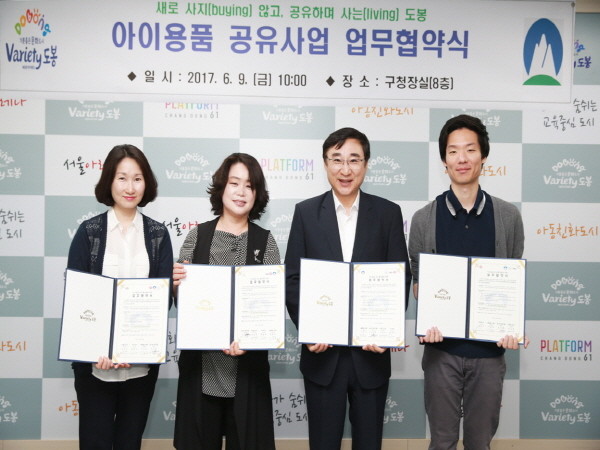 서울 도봉구가 지난 9일 구립어린이집연합회, 서울시 지정 공유기업인 씨엘인포넷, (주)어픽스와 ‘아이용품 공유사업 추진을 위한 업무협약’을 체결했다. 사진은 이동진 구청장(오른쪽에서 두 번째) 등 관계자들이 기념촬영을 하는 모습.(사진제공=도봉구청)