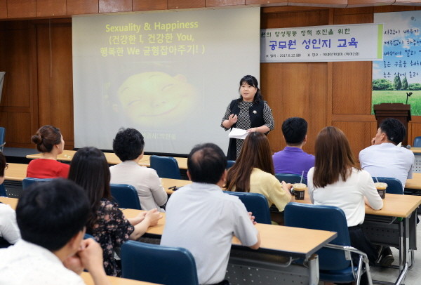 지난 12일 동대문구가 구청 직원들의 실무능력 함양을 위해 사내아카데미에서 ‘2017 공무원 성 인지 교육’을 실시했다. 사진은 사내아카데미에서 강사의 교육을 듣고있는 구청 직원들의 모습.(사진제공=동대문구청)