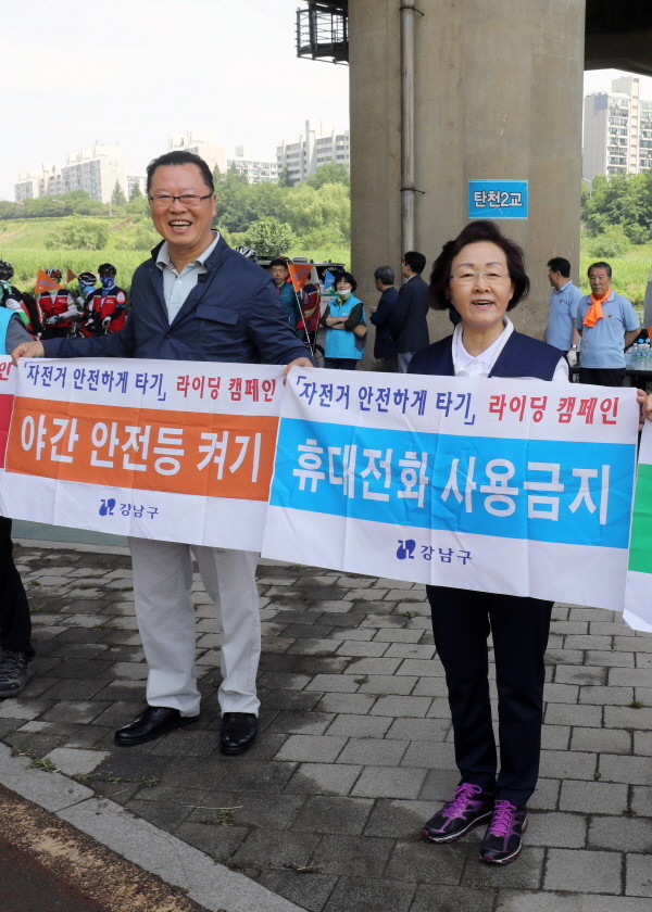 신연희 강남구청장(오른쪽)이 지난 10일 오전 강남구 탄천2교에서 열린 ‘자전거 안전하게 타기’ 라이딩 캠페인에 참석해 홍보문구 플래카드를 들고 자전거 동호회 회원 및 주민들에게 홍보하고 있다.