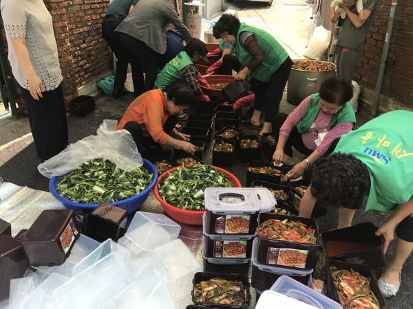 최근 서울 성동구 마장동 부녀회는 직접 담근 열무김치와 밑반찬을 이웃과 함께 나누자는 취지로 마장동 주민센터에서 ‘2017 여름맞이 김치나눔행사’를 진행했다. 사진은 부녀회원들이 김치를 담고 있는 모습.(사진제공=성동구청)