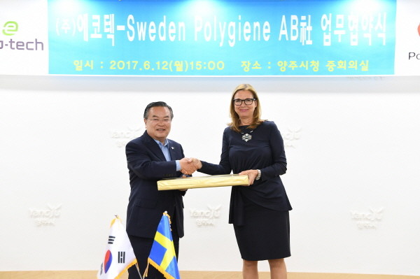 경기 양주시에 위치한 안전장갑 전문 제조업체 (주)에코텍과 스웨덴 폴리진 AB사의 '업무협약식'이 지난 12일 양주시청 중회의실에서 개최됐다. 사진은 이성호 시장과 안회그룬드 주한 스웨덴 대사가 협약을 체결한 후 악수하는 모습.(사진제공=양주시청)