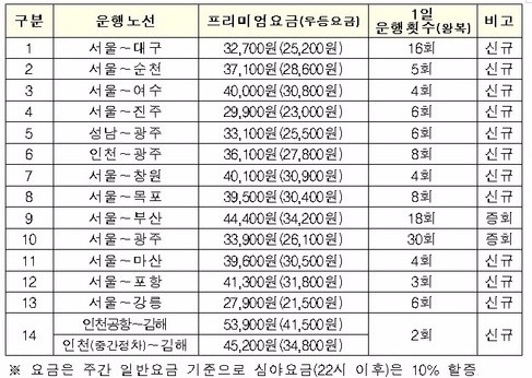 일반의 1.9배, 우등의 1.3배 수준인 프리미엄 고속버스 요금은 심야 버스 이용 시 10%의 할증 요금이 붙는다.