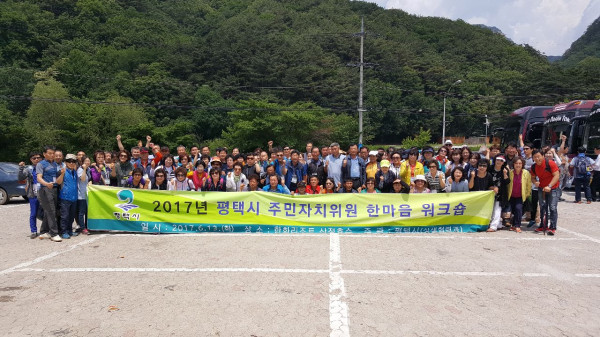경기 평택시는 13~14일 1박2일간의 일정으로 포천 산정호수 한화리조트에서 열린 ‘2017년 주민자치위원 한마음 워크숍’을 성황리에 마무리했다. 사진은 워크숍에 참석한 관계자들이 행사 종료에 앞서 기념촬영을 하는 모습.(사진제공=평택시청)
