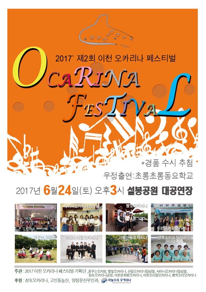 행사를 기획한 ‘2017 이천 오카리나 페스티벌’측에서는 “페이스페인팅 등의 부대행사와 간단하게 나눌 간식과 시원한 음료는 물론 오카리나, 건강검진권 등 다양한 경품도 정성껏 준비했다”며, “아름다운 오카리나 연주회로 여유로운 시간을 만끽하고, 경품도 받아가는 행운도 있길 바래본다”고 밝혔다.
