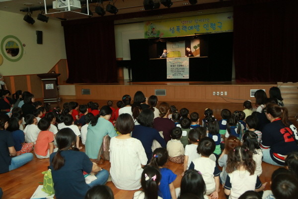 서초구가 지난 13일 서초구육아종합지원센터 지하 2층 대강당에서 아동·학부모 100여명을 대상으로 ‘예쁜 몸 소중한 몸 지켜요’ 성폭력 예방인형극을 개최했다. 사진은 엄마와 함께 인형극을 관람하고 있는 어린이들의 모습.(사진제공=서초구청)