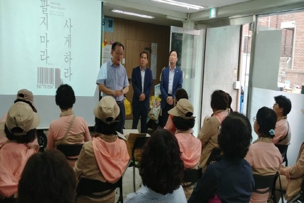 서울 은평구 진관동은 최근 동주민센터에서 신도점 야쿠르트 배달원 20여명과 함께 복지사각지대 해소와 사회안전망 확충을 위한 간담회를 했다. 사진은 참여자들이 이야기를 나누는 모습.(사진제공=은평구청)