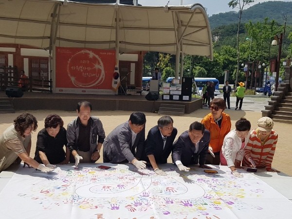 인천 남구는 지난 14일 인천무형문화재 전수교육관과 승학산에서 ‘자원봉사자 전진 대회’를 개최했다. 사진은 행사에 참석한 박우섭 구청장(가운데) 및 관계자들이 현수막에 손도장을 찍는 '동행 퍼포먼스'를 진행 중인 모습.(사진제공=남구청)