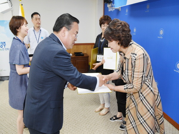 경기 양주시는 지난 14일 시청 대회의실에서 주민자치 실무자 양성교육인 ‘2017년 양주시 주민자치아카데미’ 수료식을 개최했다. 사진은 이성호 시장(왼쪽)이 수강생에게 수료증을 수여하는 모습.(사진제공=양주시청)