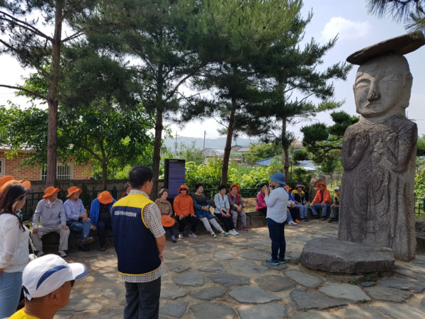 경기 용인시 기흥구 상갈동 지역사회보장협의체는 최근 지역내 저소득 취약계층 홀몸노인 20명을 대상으로 관광명소 3곳을 찾는 ‘추억의 청춘여행’을 성황리에 마무리했다. 사진은 노인들이 관광지를 방문해 해설사의 설명을 듣고 있는 모습.(사진제공=용인시청)