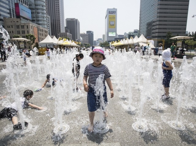 내륙지역을 중심으로 폭염특보가 확대 강화된 18일 오후 서울 광화문광장에서 어린이들이 물놀이를 하고 있다.