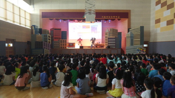 최근 서울 서초구가 언남초등학교 1, 2학년 학생들을 대상으로 재난 안전뮤지컬 ‘강철소방대 파이어로보-안전을 지켜라!’를 개최했다. 사진은 공연을 관람하고 있는 언남초등학생들의 모습.(사진제공=서초구청)