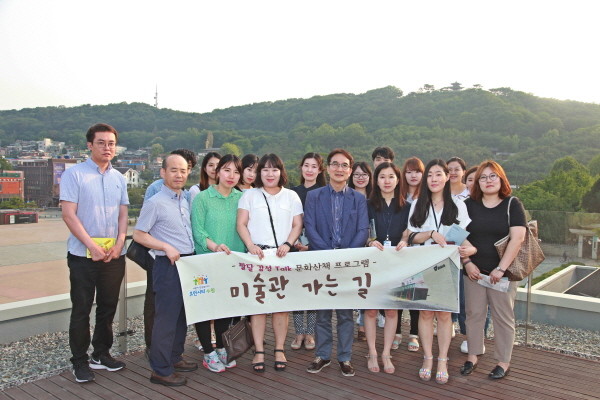 경기 수원시 팔달구는 지난 16일 직원들의 문화적 감성을 함양하고 수평적 소통 실현을 위한 ‘팔달 감성 Talk 미술관 가는 길’ 프로그램을 운영했다. 사진은 수원시립미술관을 방문한 김창범 구청장 및 직원들이 기념촬영을 하는 모습.(사진제공=팔달구청)
