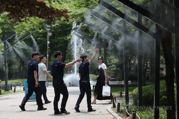 | ▲ 폭염이 이어진 19일 대구시 중구 동성로 2.28기념공원에 설치된 쿨링포그 아래로 시민이 지나가고 있다.(사진제공=연합뉴스) | ||
