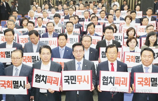 자유한국당 정우택 당대표 권한대행 겸 원내대표 및 의원들이 19일 오전 국회에서 의원총회를 열고 문재인 대통령의 강경화 외교부 장관 임명과 관련 항의 피케팅을 하고 있다.