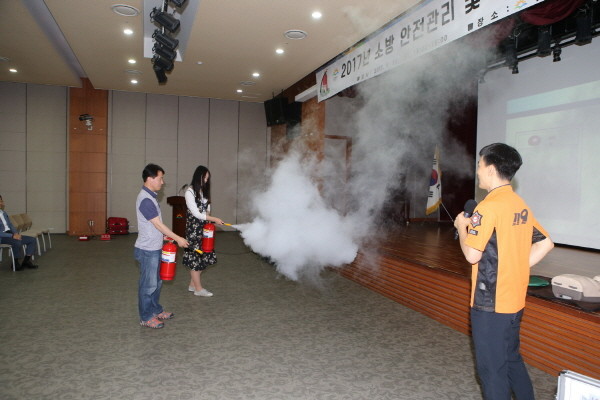 금천구는 지난 19일 오후 2시 구청 대강당에서 필수인원을 제외한 전직원이 참여하는 ‘소방 안전관리 및 응급처치 교육’을 실시했다. 사진은 참여자들이 소화기 사용 실습을 하는 모습.(사진제공=금천구청)