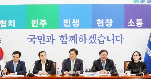 더불어민주당 우원식 원내대표(가운데)가 20일 국회에서 열린 원내대책회의를 주재하고 있다.