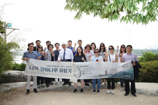 지난 20일 오후 박홍섭 마포구청장(왼쪽에서 다섯번째)이 '양화진 근대사 뱃길 탐방'에 참석해 관계자들과 기념촬영을 하고 있다. 뱃길 탐방은 잠두봉 유적지와 외국인 선교사묘원을 중심으로 양화진과 양화나루를 연계해 역사, 문화 및 자연유산을 체험할 수 있는 프로그램이다.(사진제공=마포구청)