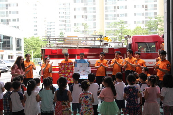 지난 20일 오전 동작구에 소재한 강남유치원생들이 동작소방서를 방문해 손편지를 전달했다. 사진은 소방관들이 어린이들이 쓴 손편지를 읽으며 즐거워하는 모습.(사진제공=동작소방서)