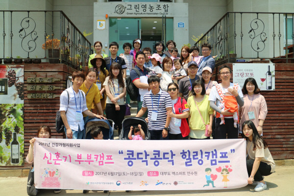경기 안산시건강가정지원센터는 지난 17~18일 양일간 대부도에서 신혼기 부부 '콩닥콩닥 힐링캠프'를 운영했다. 사진은 캠프 참여자들이 기념촬영을 하는 모습.(사진제공=안산시청)