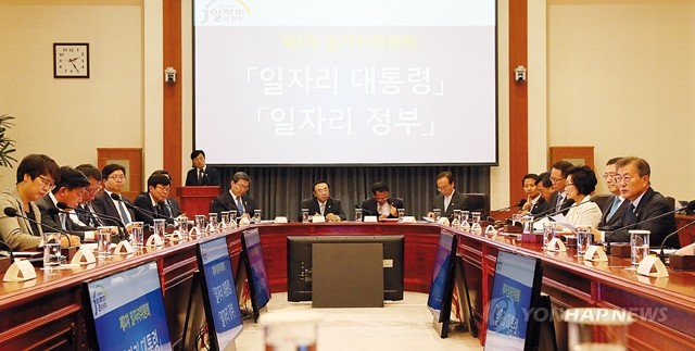 문재인 대통령이 21일 오후 청와대 본관에서 첫 일자리위원회를 주재하고 있다. 일자리위원회는 문 대통령이 취임 첫날인 지난 5월10일 제1호 업무지시를 내려 설치를 지시했고 문 대통령 본인이 일자리위원회 위원장을 맡았다.